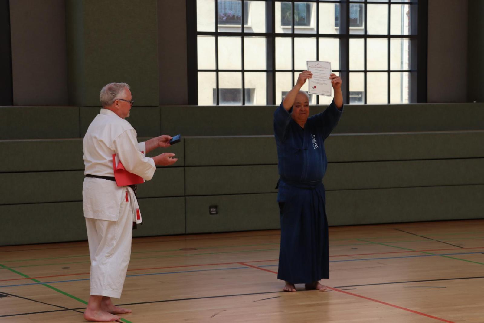 Am Ende bedankte sich der Meister bei den Ascherslebern für den sehr gut organisierten Lehrgang. „Der in Aschersleben stattfindende Karate Lehrgang ist einer der bestbesuchtesten Lehrgänge mit Shihan Oshiro innerhalb von Deutschland, wenn nicht sogar in Europa.“ so Dojoleiter Ralf Smolin. „So ein Lehrgang ist aber auch nur so gut, wie die Helfer die sich für den Erfolg, über das gewohnte Maß der Selbstverständlichkeit hinaus einsetzen.“ fügte er weiter hinzu.