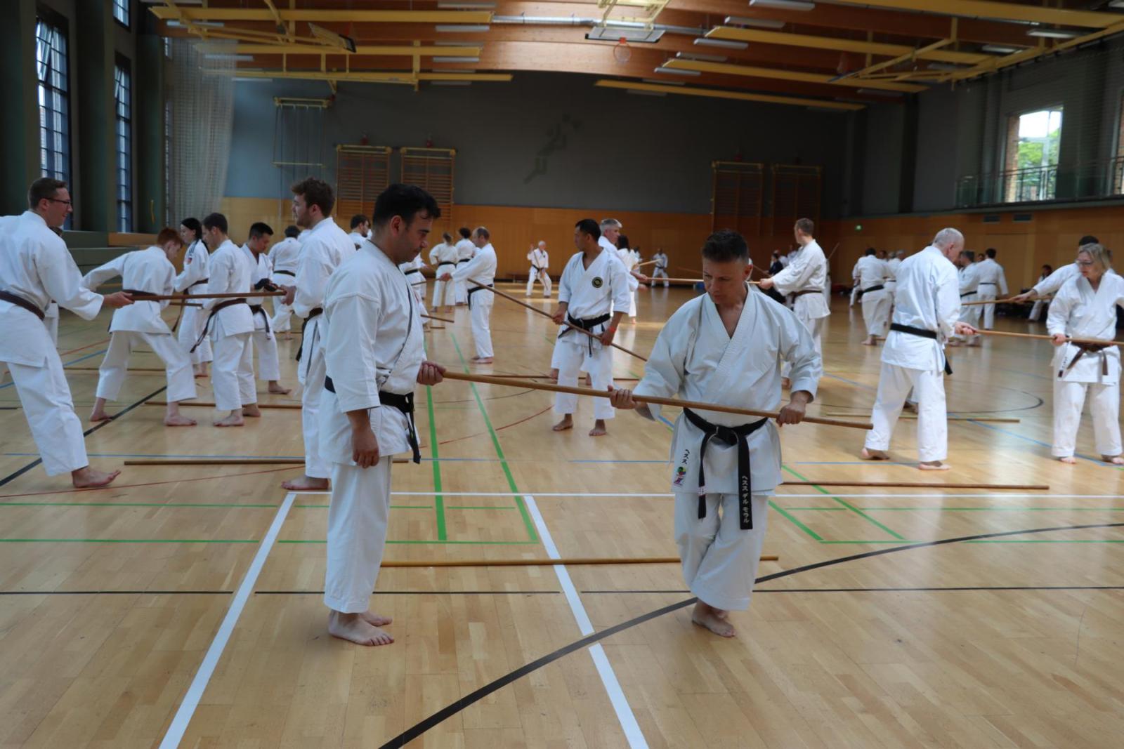 Zum Wochenendlehrgang kamen die Schüler aus den verschiedensten Ecken der Welt nach Aschersleben. Hier vermittelte Shihan Oshiro, unterstützt von Sensei Ralf Smolin, Sensei Kai Gawlitta und Sensei Yvonne Fiala sowie von den Senseis Hiro Obara (USA) und Eisaku Shimoji (Japan) den Lehrgangsteilnehmern Karatetechniken sowie Karate- und Kobujutsu Kata.