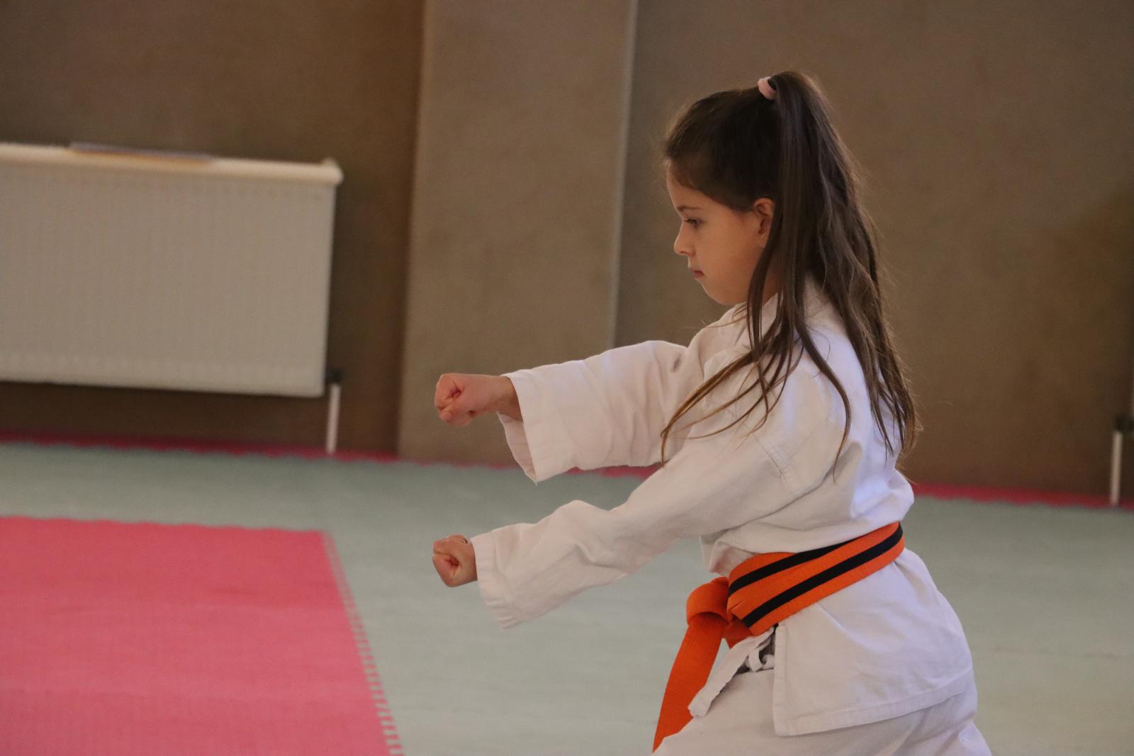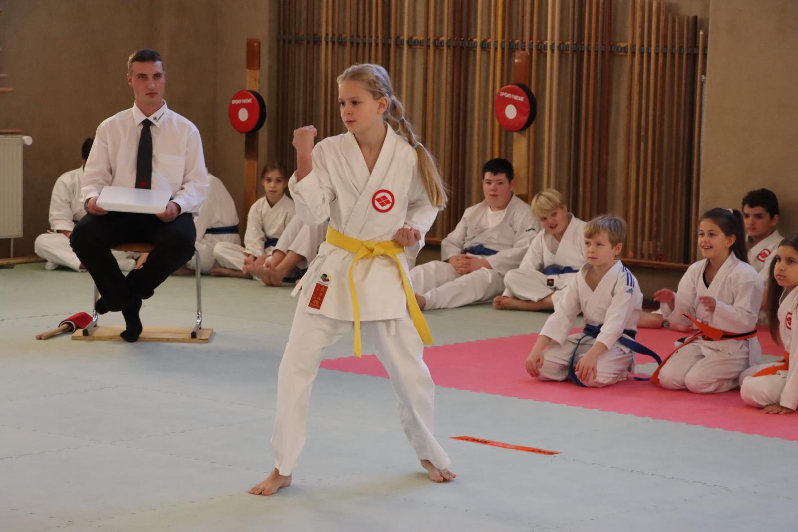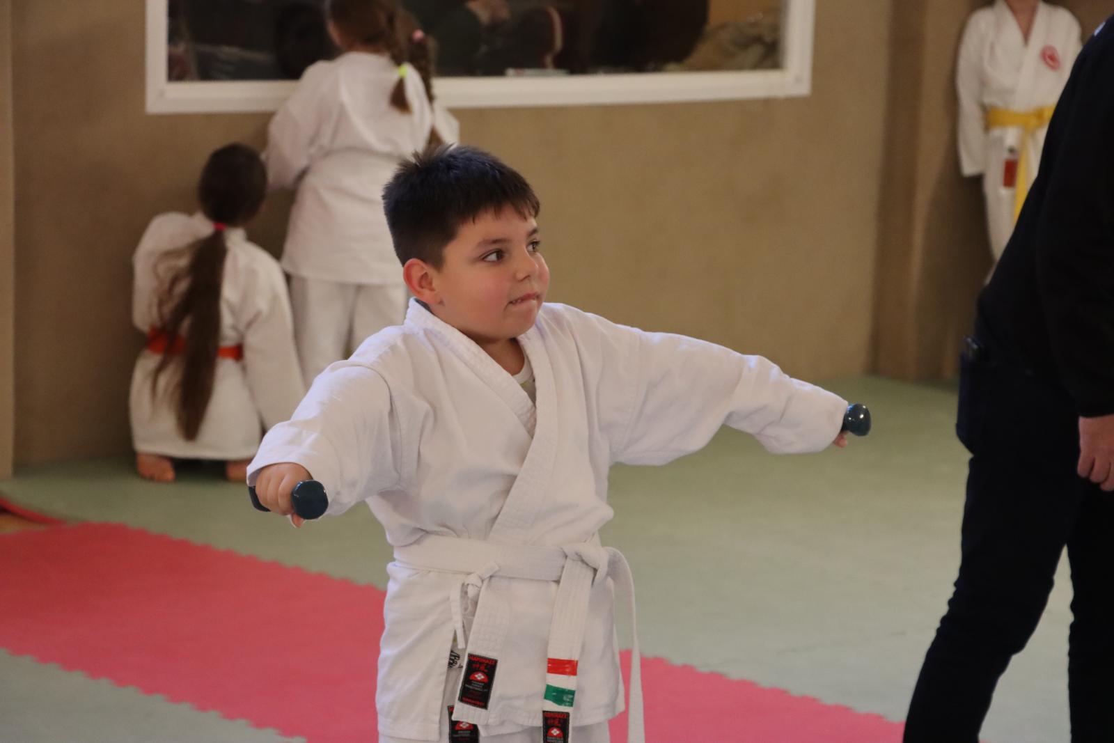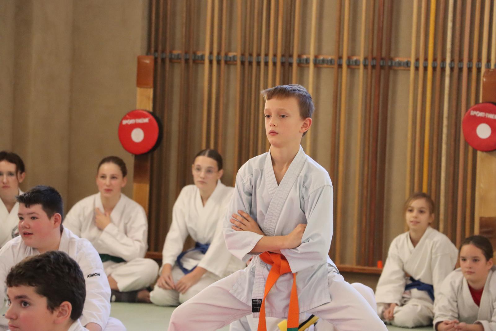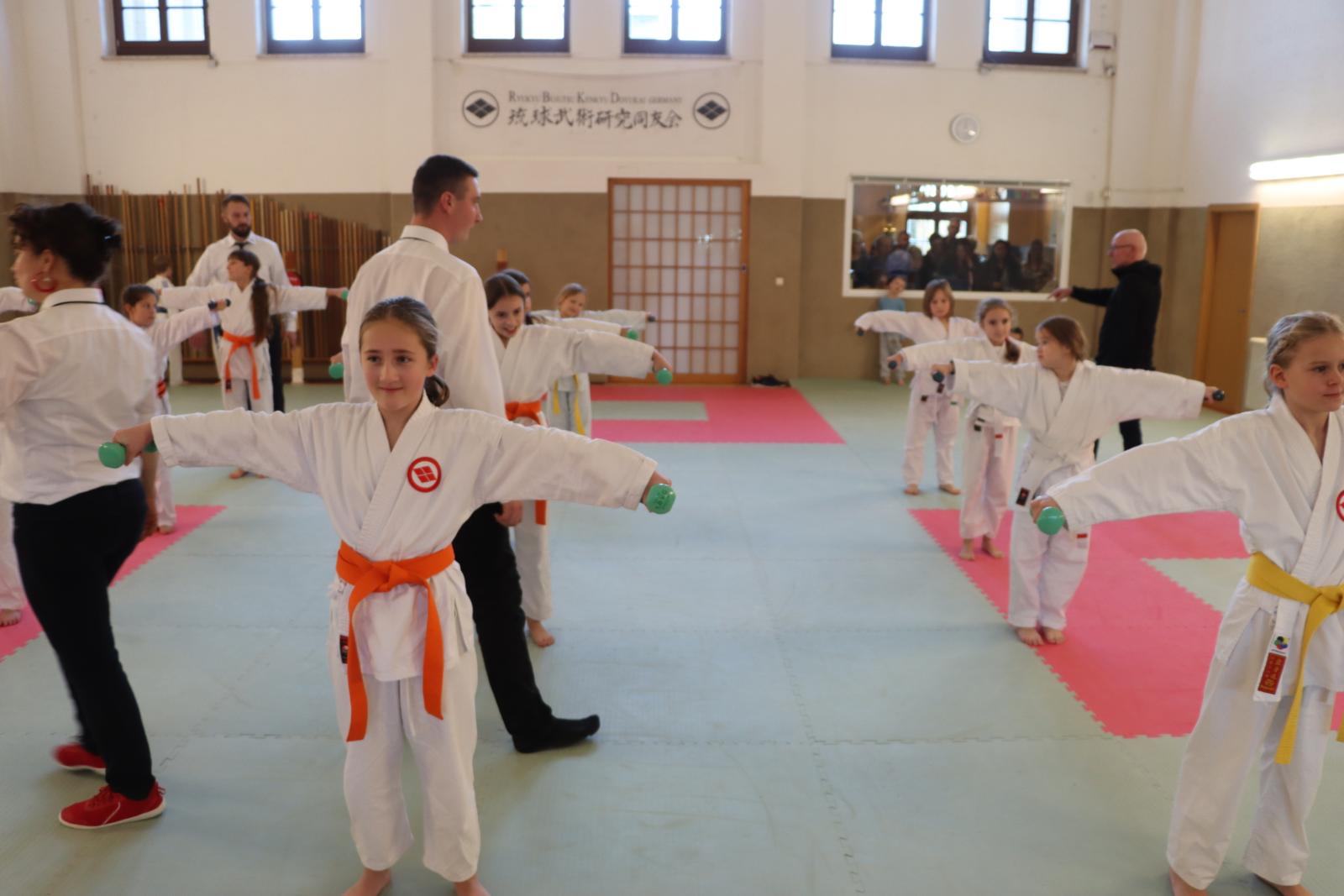 Das Highlight des Turniers war die Abschlussdisziplin „Stärkster Karateka“. Hier hatten auch unsere ganz neuen Mitglieder die Möglichkeit teilzunehmen – unabhängig davon, ob sie schon eine Kata in Karate, Bo oder Sai beherrschen. Die Kinder traten in zwei Gruppen (Jungen und Mädchen) gegeneinander an, wobei Alter und Gürtelfarbe keine Rolle spielten. Es war beeindruckend zu sehen, wie sowohl die Kleinsten als auch die Größten über sich hinauswuchsen. Dabei konnten die Zuschauer erleben, dass es nicht immer die Ältesten oder Erfahrensten waren, die den Sieg davontrugen.