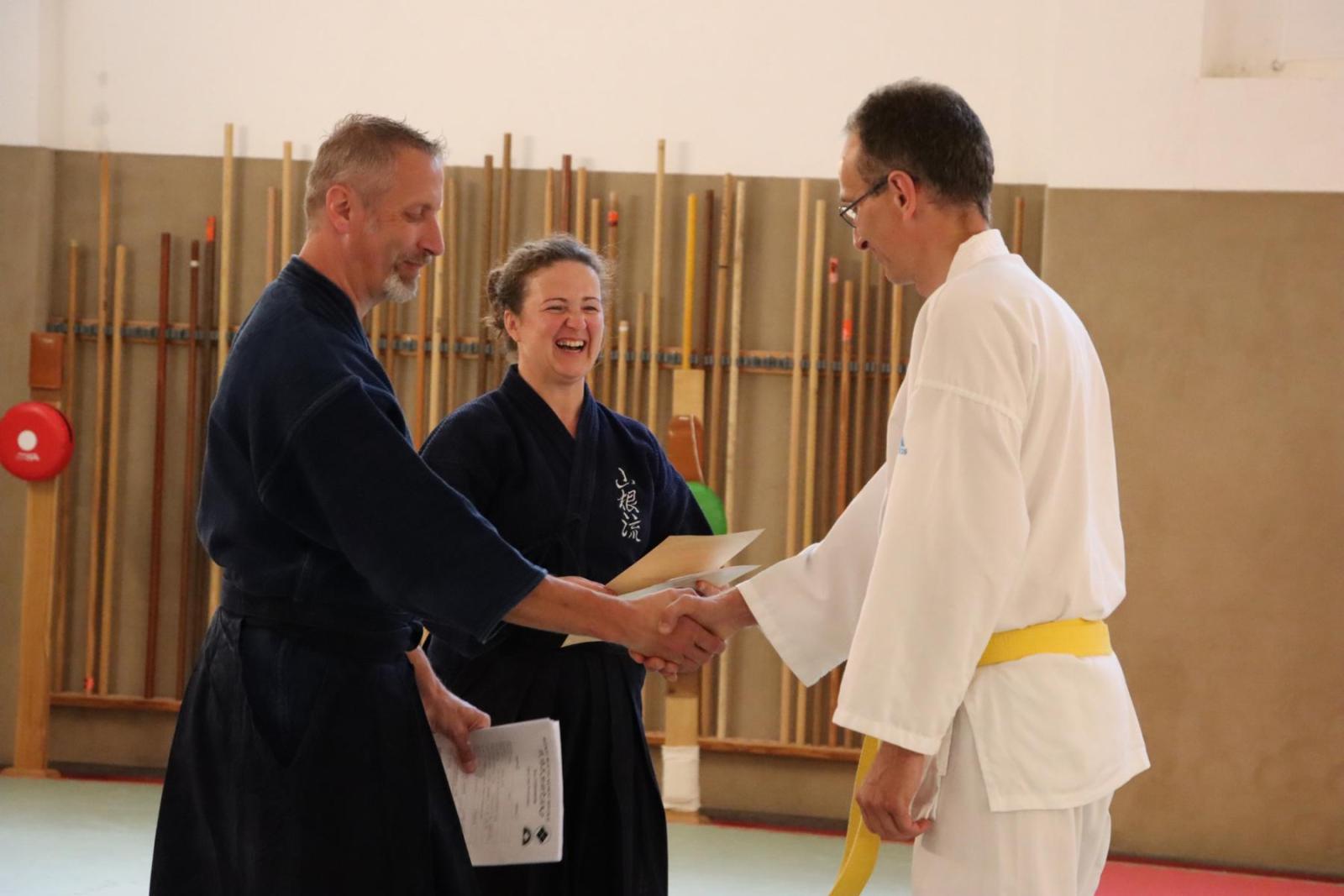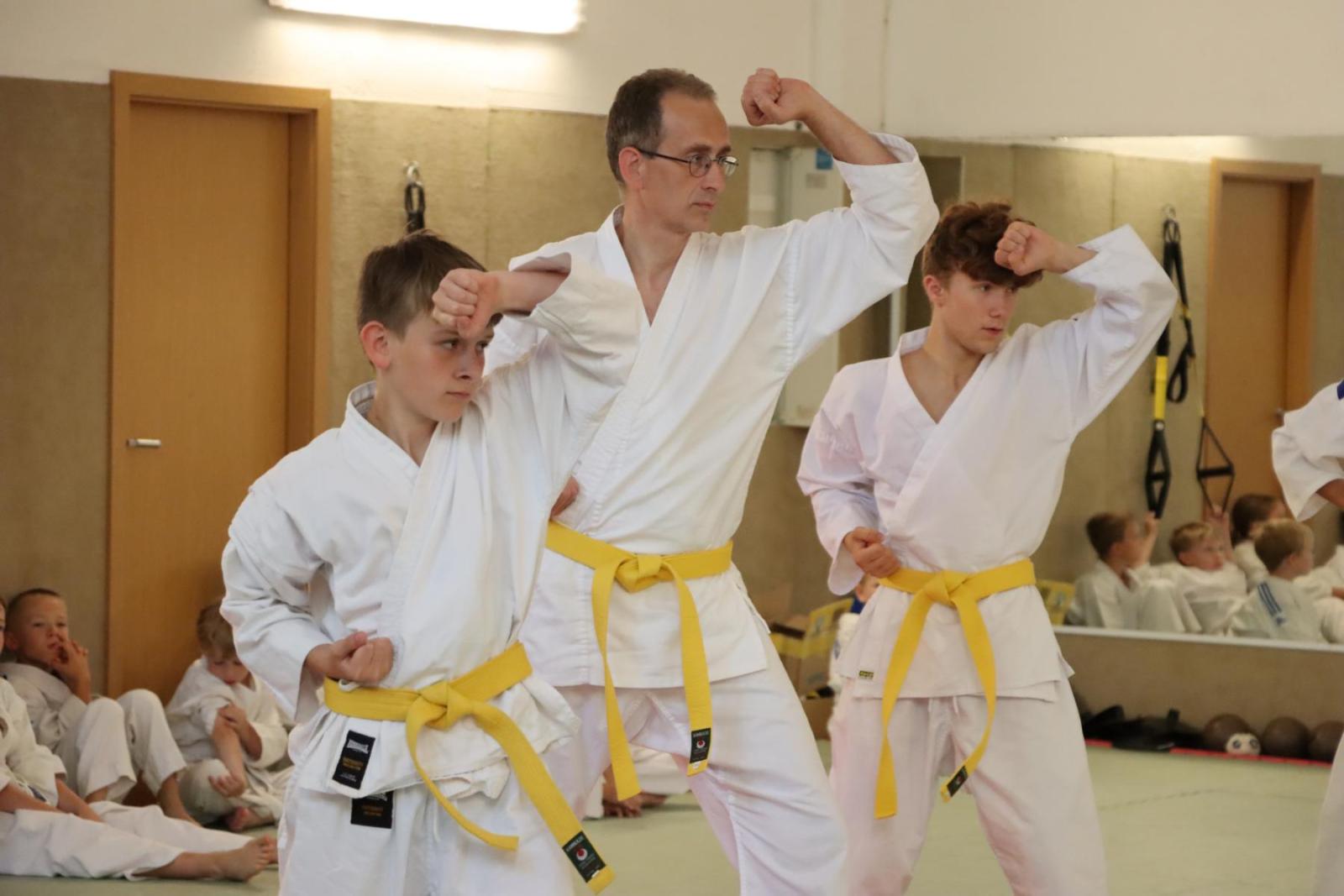 Um sich optimal auf die Prüfung vorzubereiten, gab es zuvor noch ein zweistündiges prüfungsvorbereitendes Training, welches den Prüflingen „den letzten Schliff“ geben sollte. Das Training leitete Sensei Ralf Smolin mit Unterstützung der Senseis Yvonne Fiala und Stefan Born. Im Training wurden noch einmal die prüfungsrelevanten Karate-Techniken und Katas geübt. Es gab hier und da den einen oder anderen Hinweis, was jeder noch an seiner Technik und seiner Kata verbessern kann. Mit diesem Wissen ging es dann in die Prüfung, die im Anschluss an das Training von den drei Senseis abgenommen wurde.